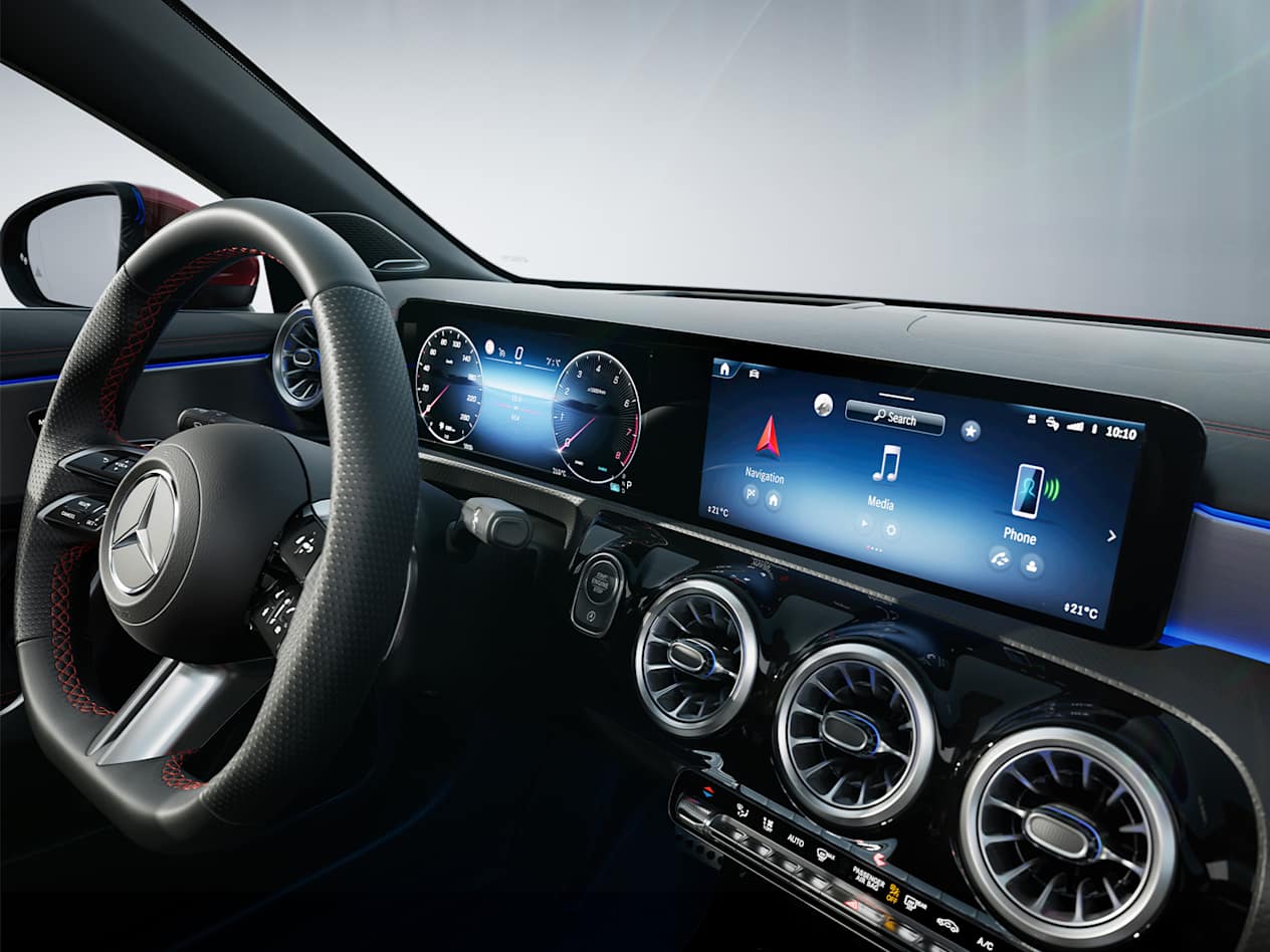 MBUX останнього покоління З появою останнього покоління нашої мультимедійної системи MBUX інтер'єр CLA Shooting Brake стає ще більш цифровим та інтелектуальним. LCD-екрани дозволяють інтуїтивно керувати функціями автомобіля голосом, дотиком або жестами, при цьому система щоразу потроху навчається. Зовнішній вигляд дисплеїв можна індивідуалізувати за допомогою трьох стилів відображення та трьох режимів (Навігація, Допомога, Сервіс).