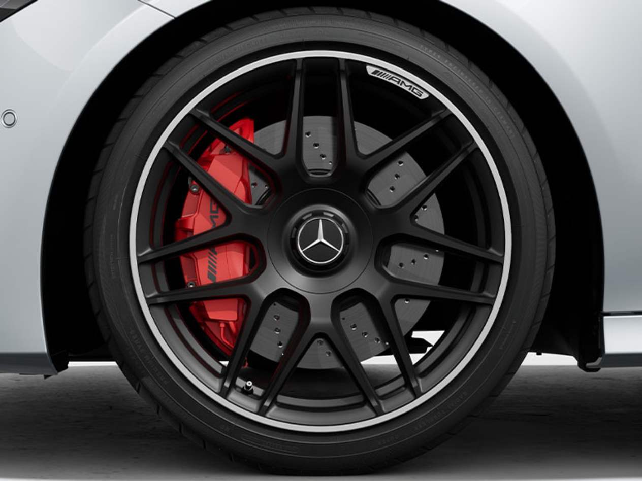 Легкосплавні колісні диски AMG і високоефективна гальмівна система AMG [CLA 35 4MATIC Shooting Brake] Легкосплавні колісні диски AMG діаметром 48,3 см (19") у дизайні з п'ятьма подвійними спицями і високоефективна гальмівна система AMG з червоними гальмівними супортами (опція) допомагають надати вашому Mercedes-AMG ще більш динамічний зовнішній вигляд.