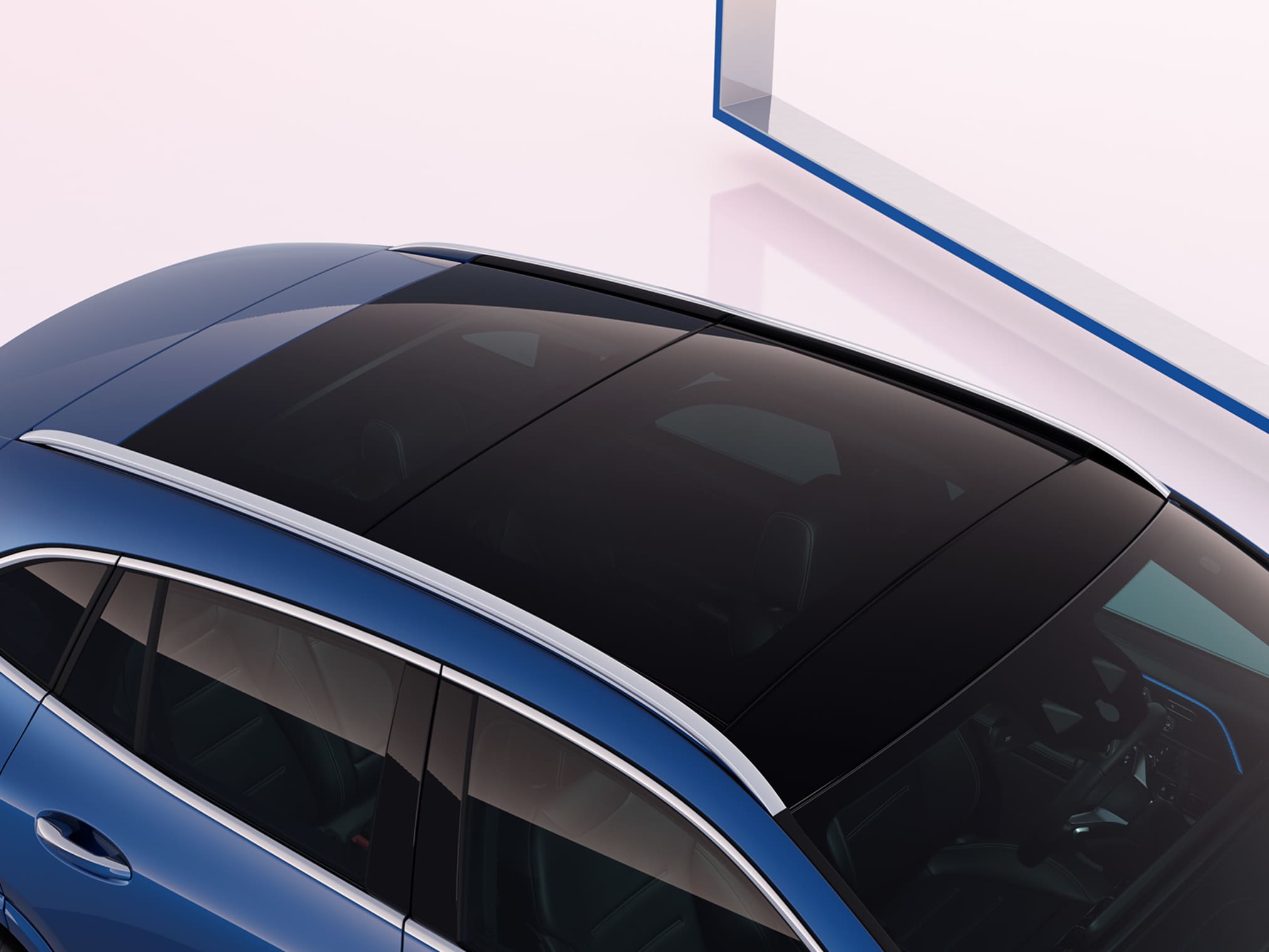 Панорамний розсувний дах Високоякісний панорамний розсувний дах в новому EQA забезпечує доступ великої кількості світла в салон через великі скляні панелі, створюючи в автомобілі світлу, дружню та приємну атмосферу.[1]