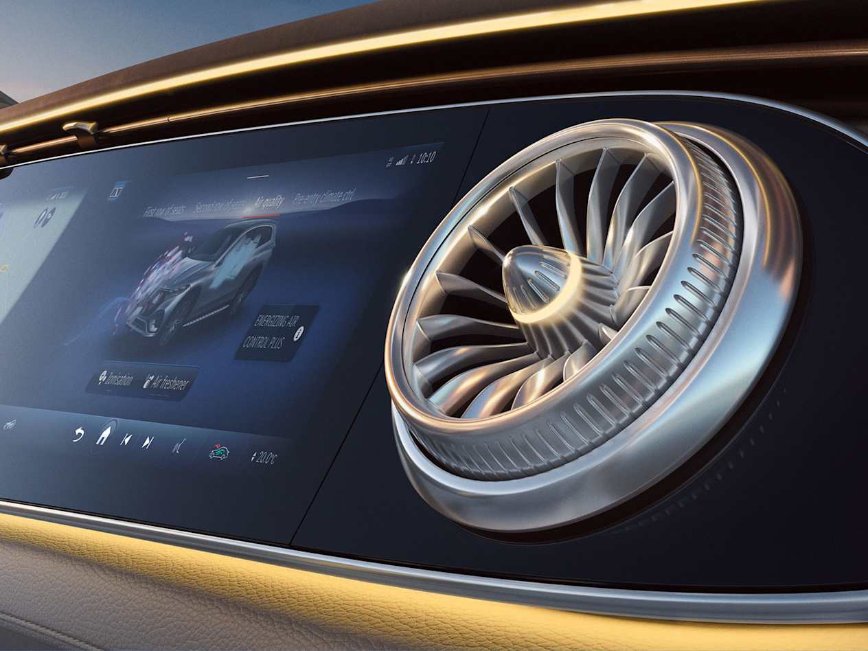 Ексклюзивні матеріали та інноваційні елементи оздоблення Ексклюзивні та інноваційні матеріали оббивки та поверхонь створюють вражаючу розкішну естетику інтер’єру. Наприклад, першокласний дерев’яний декоративний елемент з алюмінієвими вставками. На відкритій пористій деревині горіха лазером вирізаний фірмовий паттерн із зірок і заповнений алюмінієм[4] за допомогою точного процесу пресування.