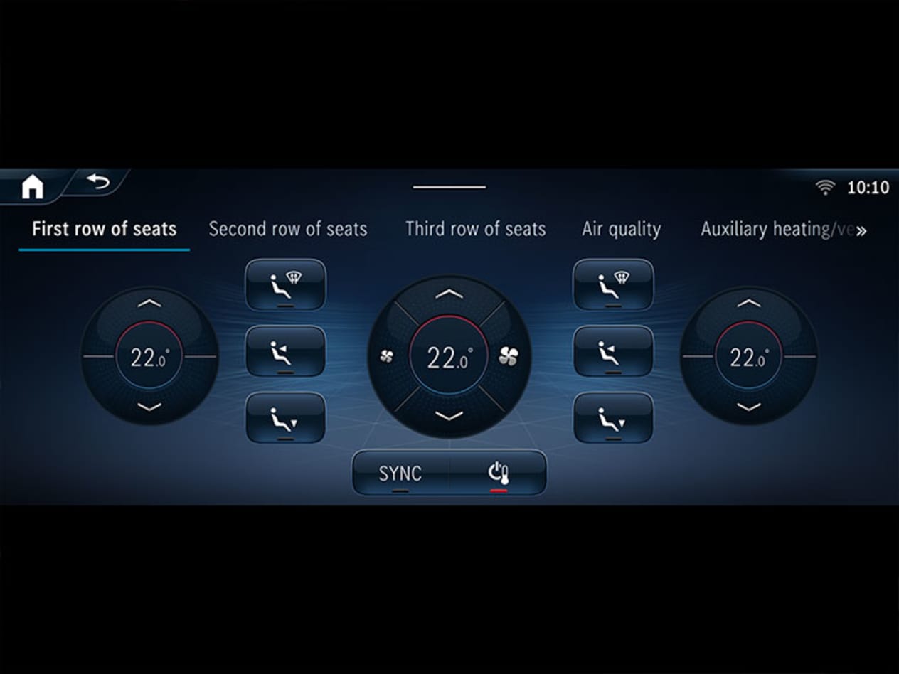 Мультимедійна система MBUX High-End у задній частині салону Інтелектуальний комфорт розваг: мультимедійна система MBUX для задніх пасажирів[3] доступна для всіх варіантів сидінь. Вона містить два сенсорні екрани формату 17,8 см (7"). Це дозволяє пасажирам на другому ряду сидінь насолоджуватися фільмами або музикою, користуватися вбудованим веб-браузером або продивлятися і вводити інформацію щодо поїздки.
