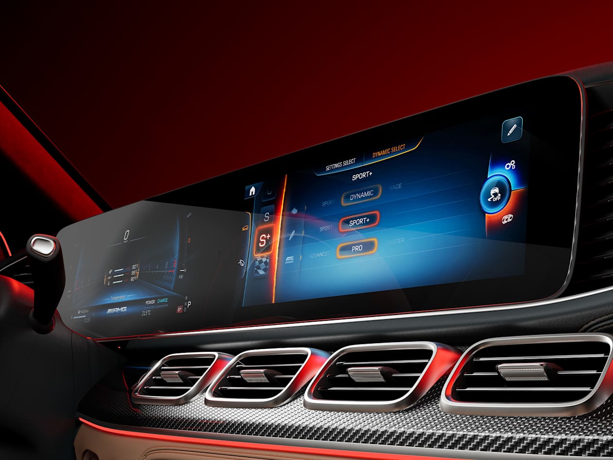 Широкоформатний дисплей передньої панелі з індикацією в стилі AMG На високоякісній широкоформатній панелі зі специфічним для AMG дизайном та інноваційним проекційним дисплеєм ви можете не тільки вибирати різні стилі відображення, але й розміщувати і налаштовувати контент індивідуально відповідно до ваших побажань завдяки інтелектуальній інформаційно-розважальній системі MBUX.