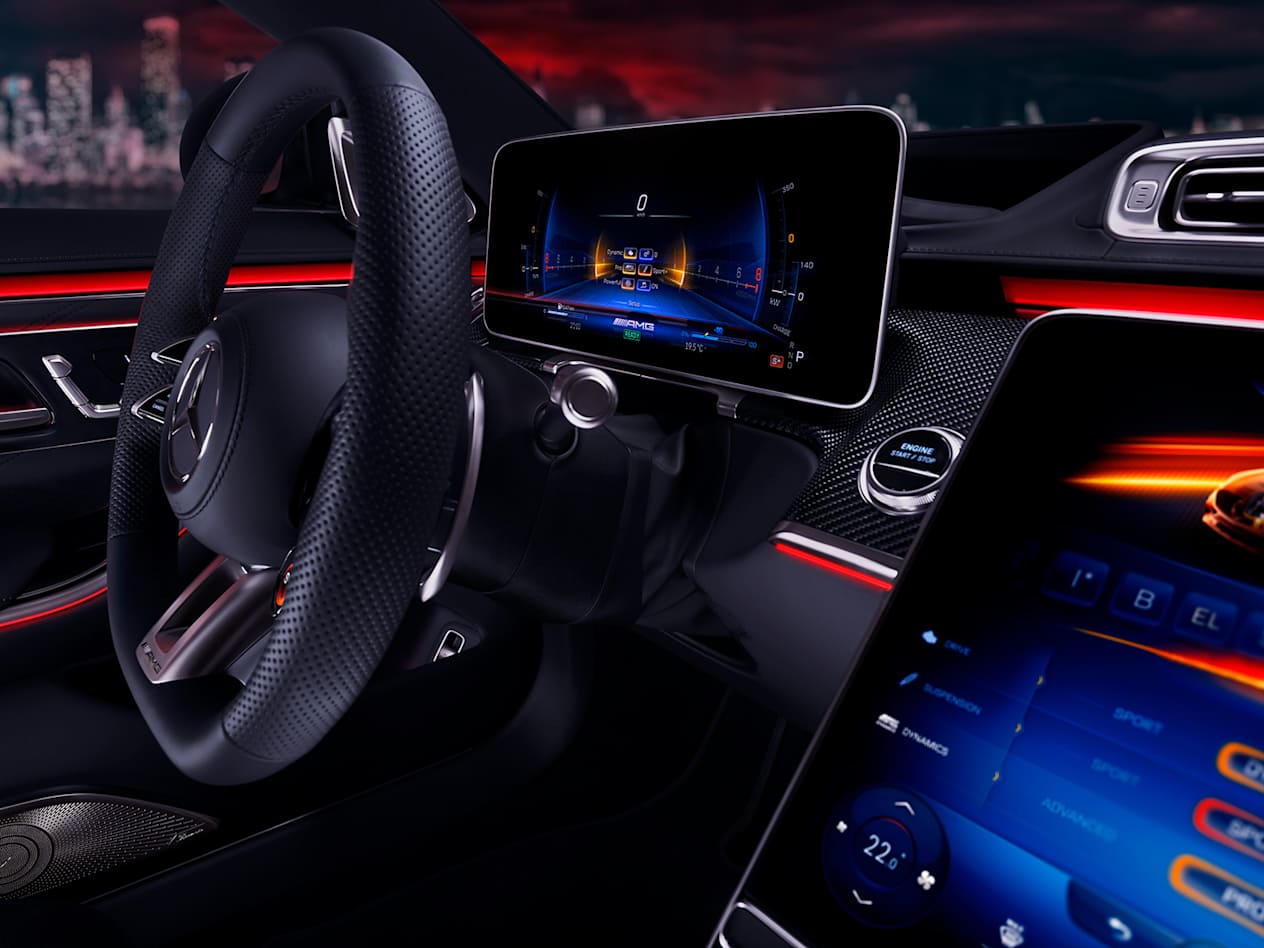Мультимедійна система MBUX з комбінацією приладів та стилями дисплея, характерними для AMG Cпортивний дизайн та інноваційна концепція управління та відображення поєднуються у мультимедійній системі MBUX другого покоління. Вона візуалізує динамічний підхід з індивідуальними стилями дисплея AMG та доповнюється рядом інформативних дисплеїв та функцій, характерних для гібридів.