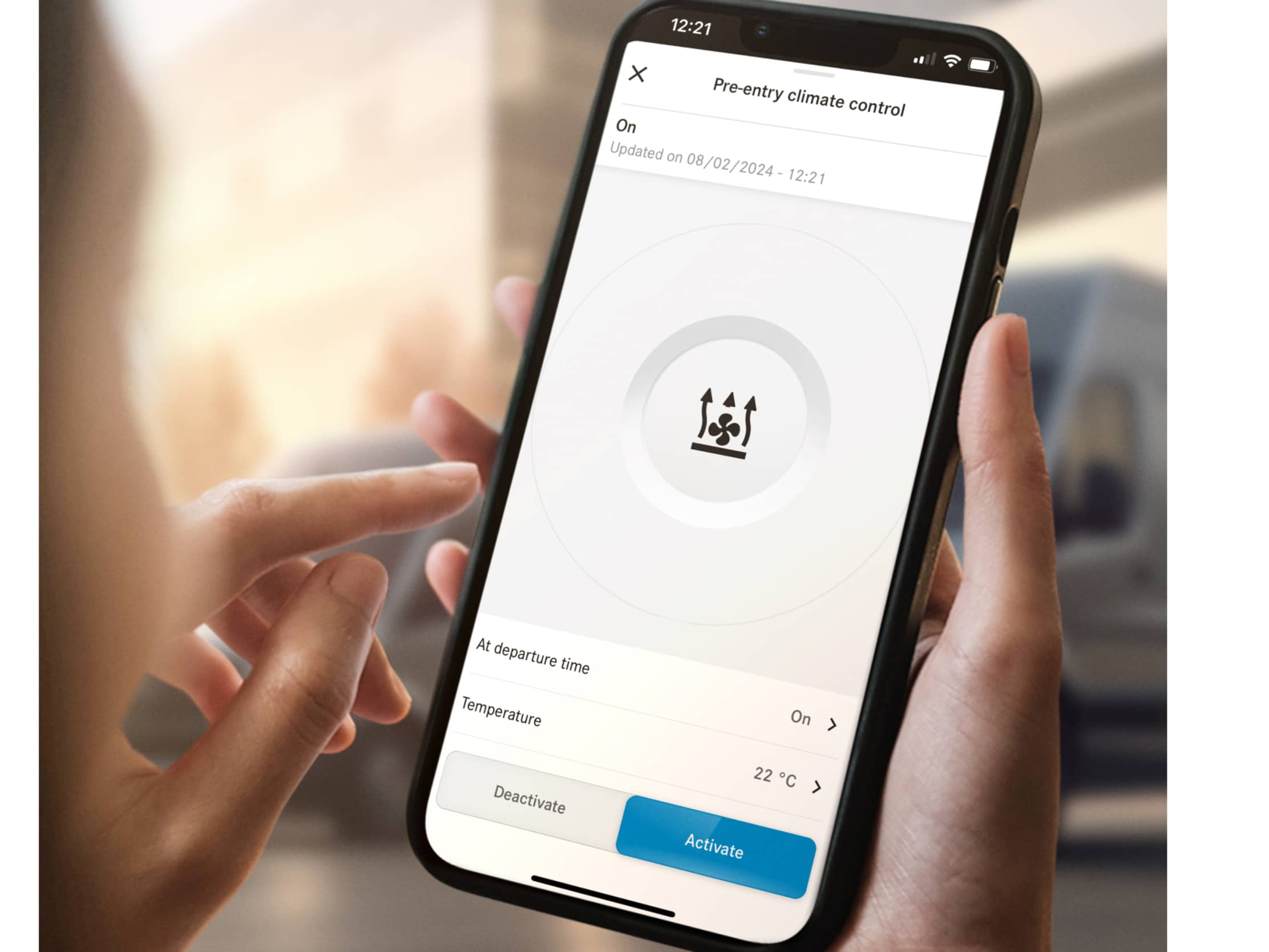 Система попереднього клімат-контролю Вирушайте в дорогу вже з комфортною температурою в салоні. Система попереднього клімат-контролю може також за вашим бажанням охолоджувати або обігрівати автомобіль під час заряджання, що забезпечить повний заряд батареї на момент початку руху.